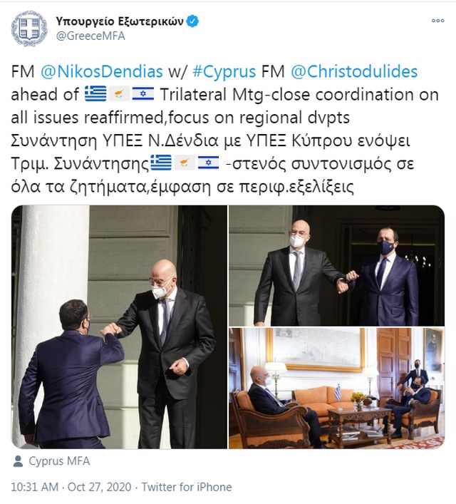 Συνάντηση με τον υπουργό Εξωτερικών της Κύπρου Νίκο Χριστοδουλίδη πραγματοποίησε ο υπουργός Εξωτερικών Νίκος Δένδιας, ενόψει της τριμερούς συνάντησης Ελλάδας- Κύπρου – Ισραήλ που θα πραγματοποιηθεί αργότερα σήμερα Τρίτη.