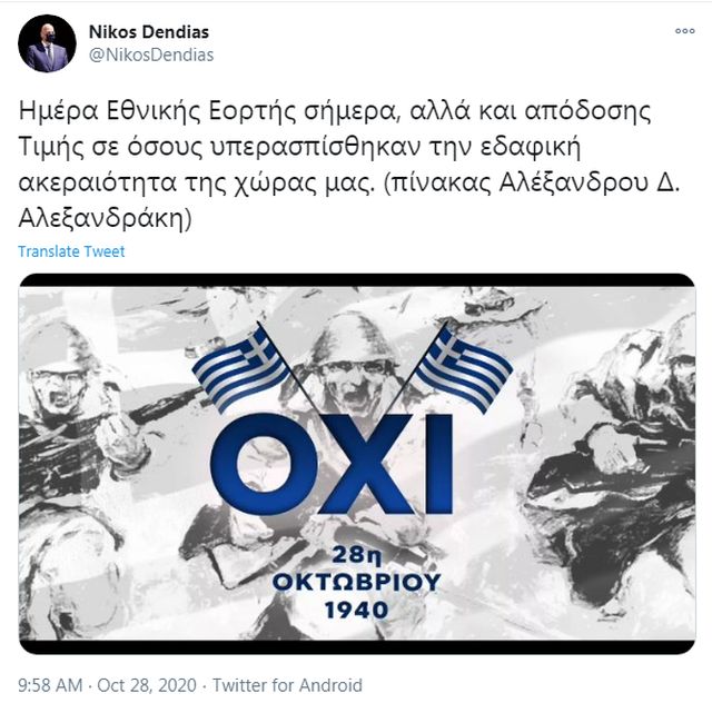 «Ημέρα Εθνικής Εορτής σήμερα, αλλά και απόδοσης Τιμής σε όσους υπερασπίσθηκαν την εδαφική ακεραιότητα της χώρας μας» τονίζει σε μήνυμά του στα μέσα κοινωνικής δικτύωσης για τη σημερινή εθνική επέτειο της 28ης Οκτωβρίου, ο υπουργός Εξωτερικών Νίκος Δένδιας.