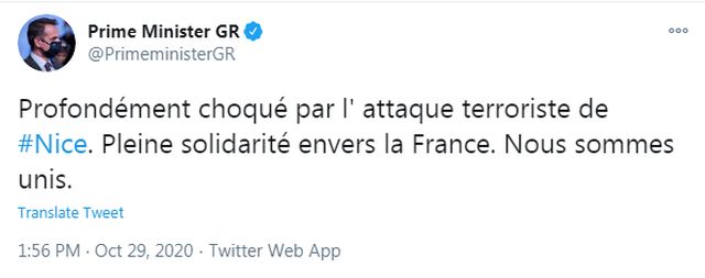 Ο πρωθυπουργός Κυριάκος Μητσοτάκης έκανε την εξής ανάρτηση στα γαλλικά στο Twitter, για τη σημερινή τρομοκρατική επίθεση στη Νίκαια της Γαλλίας: