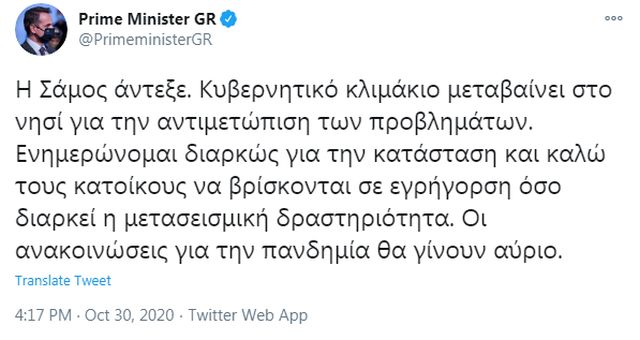 Ο Κυριάκος Μητσοτάκης με μήνυμά του στο twitter τόνισε ότι «η Σάμος άντεξε» και κάλεσε τους πολίτες να είναι σε εγρήγορση λόγω της μετασεισμικής ακολουθίας.