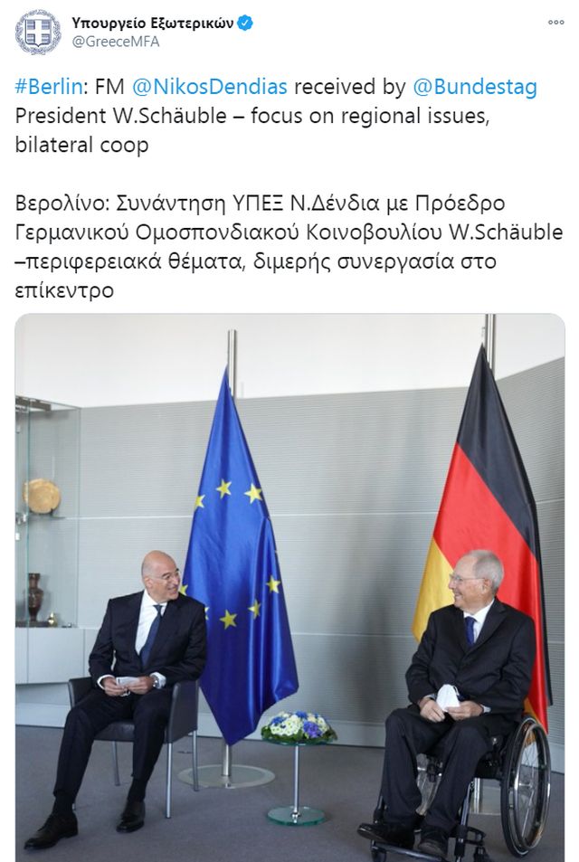 Νωρίτερα ο Νίκος Δένδιας συναντήθηκε με τον πρόεδρο του Γερμανικού Ομοσπονδιακού Κοινοβουλίου Βόλφγκανγκ Σόιμπλε.