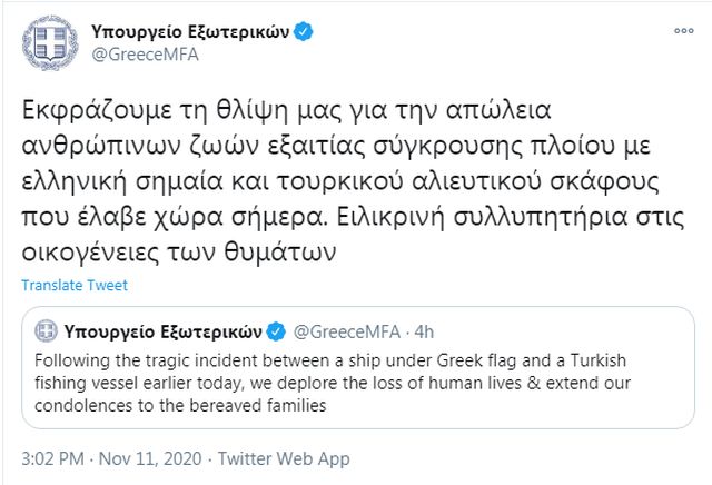 «Εκφράζουμε τη θλίψη μας για την απώλεια ανθρώπινων ζωών εξαιτίας σύγκρουσης πλοίου με ελληνική σημαία και τουρκικού αλιευτικού σκάφους που έλαβε χώρα σήμερα.