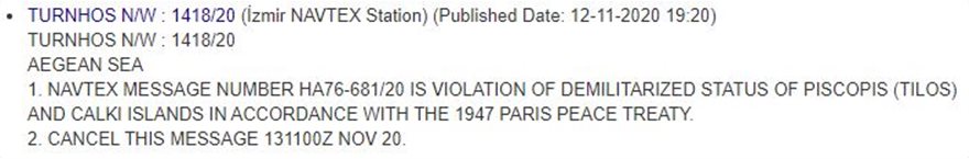 Την αποστρατικοποίηση της Τήλου και της Χάλκης ζητά με νέα Navtex που εξέδωσε την Πέμπτη το απόγευμα η Τουρκία, εμμένοντας στις προκλητικές ενέργειές της απέναντι στην Ελλάδα.