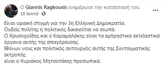 Σε ανάρτησή του στο Facebook αναφέρει: