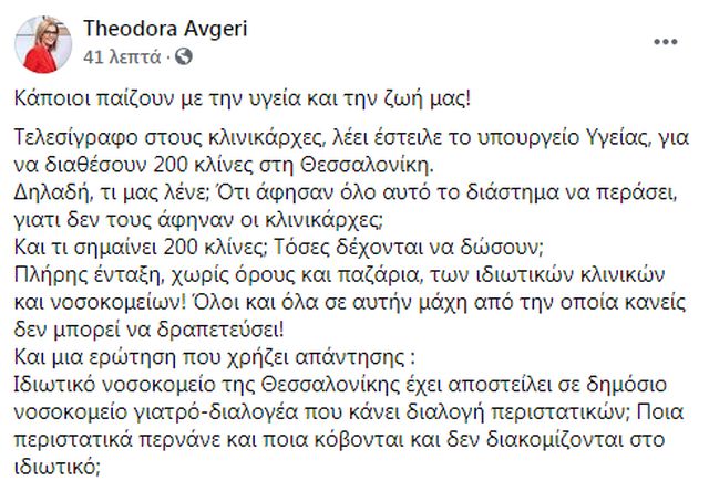 Η δημοσιογράφος και βουλευτής Θεσσαλονίκης του ΣΥΡΙΖΑ-ΠΣ, Δώρα Αυγέρη, καταγγέλλει με ανάρτησή της στο Facebook ότι «κάποιοι παίζουν με την υγεία και την ζωή μας!» και αναφέρει πολύ σοβαρές κατηγορίες: