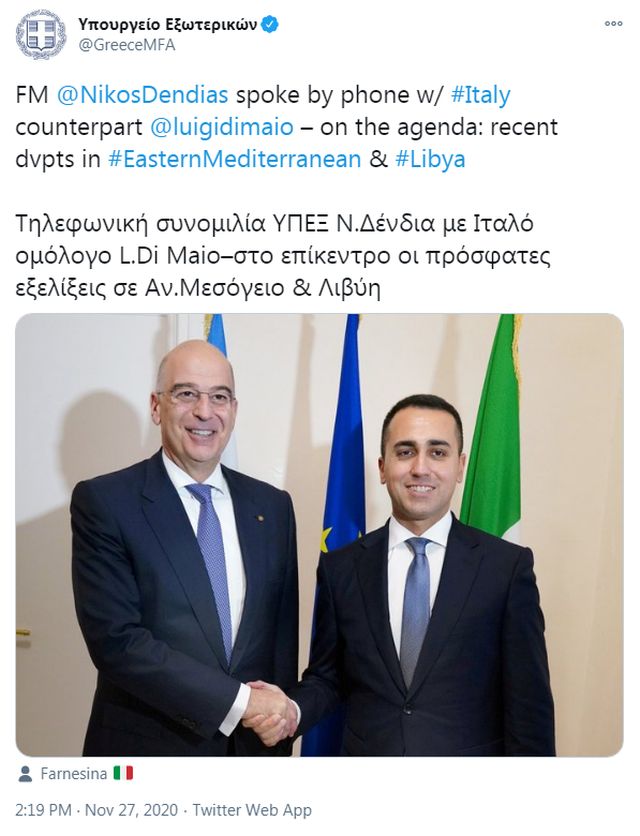 Τηλεφωνική επικοινωνία με τον υπουργό Εξωτερικών της Ιταλίας, Λουίτζι Ντι Μάιο, πραγματοποίησε νωρίτερα την Παρασκευή ο υπουργός Εξωτερικών, Νίκος Δένδιας.