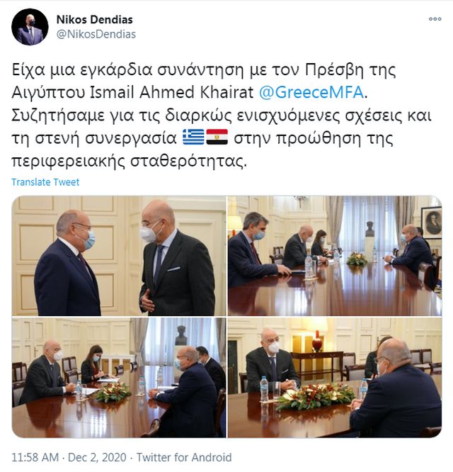 Συνάντηση με τον Αιγύπτιο πρέσβη Ισμαήλ Άχμεντ Χαϊράτ πραγματοποίησε νωρίτερα την Τετάρτη ο υπουργός Εξωτερικών Νίκος Δένδιας στο υπουργείο Εξωτερικών.