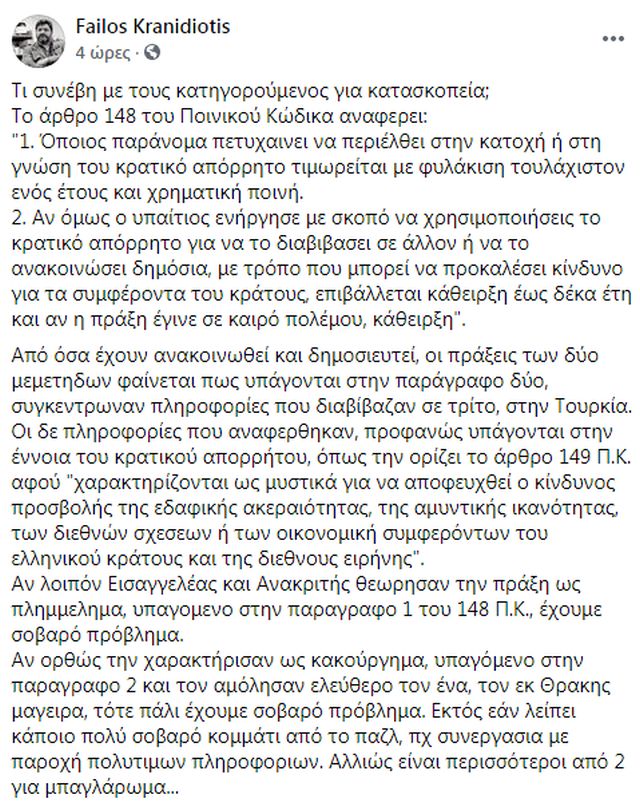 »Από όσα έχουν ανακοινωθεί και δημοσιευτεί, οι πράξεις των δύο μεμέτηδων φαίνεται πως υπάγονται στην παράγραφο δύο, συγκέντρωναν πληροφορίες που διαβίβαζαν σε τρίτο, στην Τουρκία.