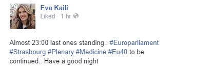 Και πρέπει να έκανε και στην ίδια εντύπωση, να είναι στις 23.00 το βράδυ μέσα στο Ευρωκοινοβούλιο, ώστε έγραψε στο Facebook: