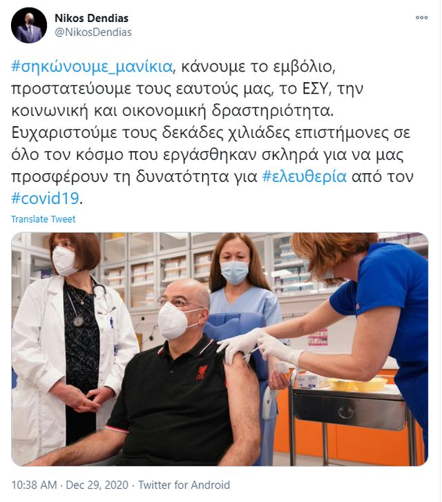 Εμβολιάστηκε την Τρίτη ο υπουργός Εξωτερικών Νίκος Δένδιας. Ο επικεφαλής της ελληνικής διπλωματίας σε ανάρτησή του στο Twitter αναφέρει: