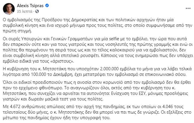 Ο πρόεδρος του ΣΥΡΙΖΑ και αρχηγός του μεγαλύτερου κόμματος της δημοκρατικής παράταξης, σε ανάρτησή του στο Facebook επικρίνει τα κυβερνητικά στελέχη που κάνουν ουρά για τα εμβόλια όταν αυτά δεν επαρκούν για τους γιατρούς και τους νοσηλευτές.