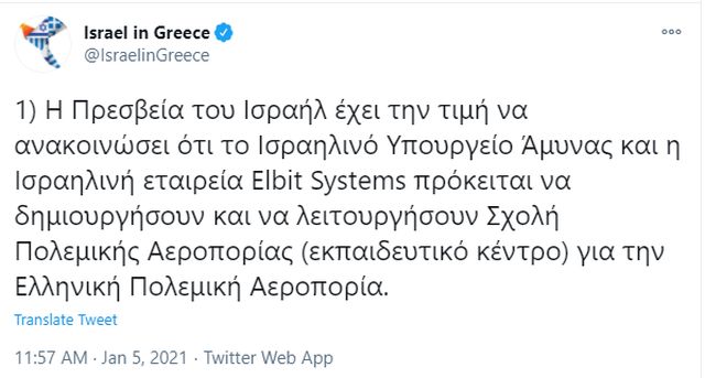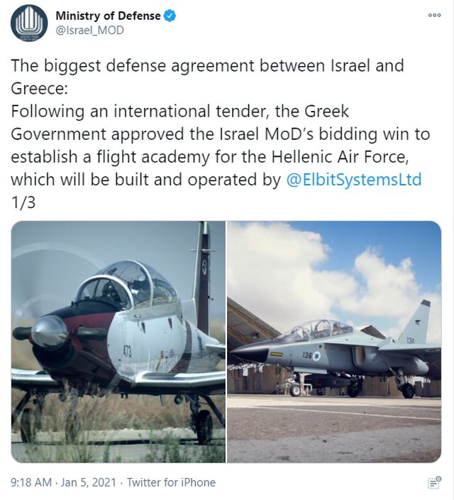 Σε αυτό το πλαίσιο, αναφέρει πως στο άμεσο μέλλον, η SIBAT, η Διεύθυνση για την Διεθνή Αμυντική Συνεργασία στο υπουργείο Άμυνας του Ισραήλ και η Elbit Systems θα υπογράψουν τη συμφωνία για τη δημιουργία Ελληνικής Σχολής Πολεμικής Αεροπορίας (εκπαιδευτικό κέντρο), με πρότυπο τη σχολή της Πολεμικής Αεροπορίας του Ισραήλ (IAF).
