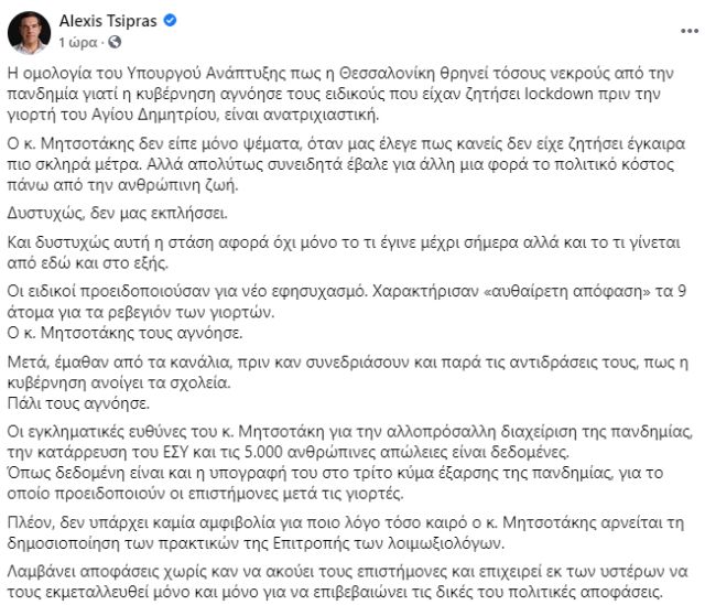 Στην ανάρτησή του στα κοινωνικά δίκτυα ο κ. Τσίπρας ξεκινά από την δήλωση του Άδωνι Γεωργιάδη για την καθυστέρηση του lockdown στην Θεσσαλονίκη: