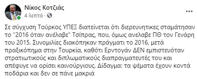 Ηχηρό ράπισμα στον Μεβλούτ Τσαβούσογλου έριξε τη Δευτέρα ο Νίκος Κοτζιάς με ανάρτησή του σε Facebook και Twitter, απαντώντας στον ισχυρισμό του Τούρκου υπουργού Εξωτερικών, νωρίτερα τη Δευτέρα, ότι για τη διακοπή των διερευνητικών το 2016 ευθύνεται η τότε ελληνική κυβέρνηση: «Όμως όταν στην εξουσία ήρθε η κυβέρνηση Τσίπρα το 2016 δεν ήθελε να συνεχίσει τις συναντήσεις αυτές», ισχυρίστηκε ο Τούρκος.