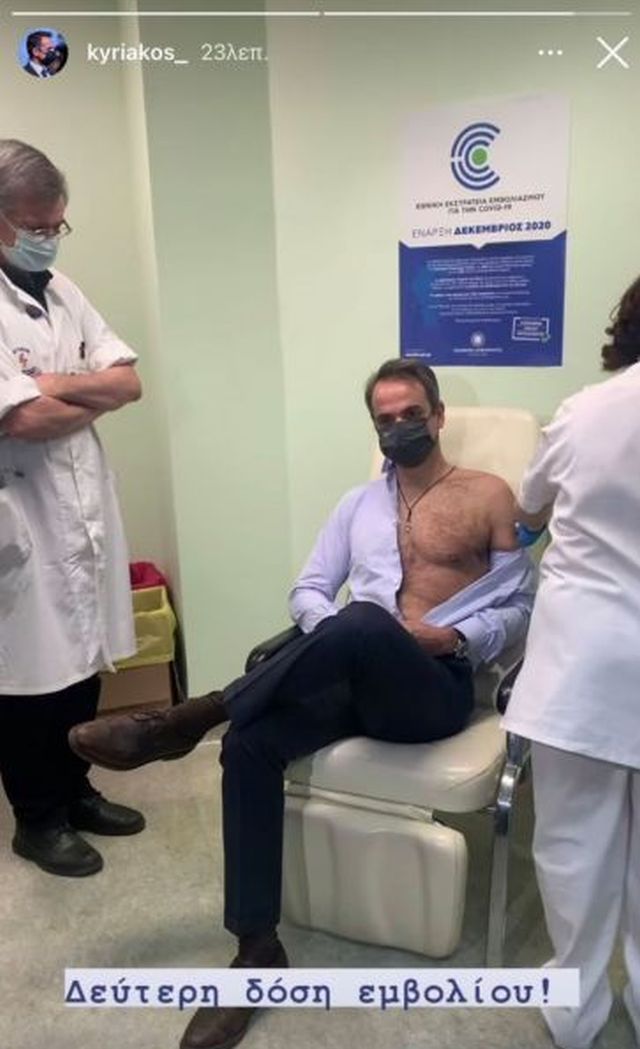 Αν και το κρύο είναι τσουχτερό, χωρίς φανελάκι ο Κυριάκος Μητσοτάκης έκανε το πρωί της Δευτέρας τη δεύτερη δόση του εμβολίου κατά του κορωνοϊού.
