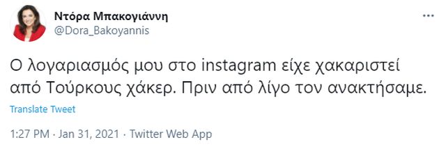 Θύμα Τούρκων χάκερ «έπεσε» ο λογαριασμός της Ντόρας Μπακογιάννη στο Instagram. Η εμβληματική φράση του Κεμάλ Ατατούρκ «Πόσο χαρούμενος είν’ εκείνος που λέει Είμαι Τούρκος!» τοποθετήθηκε ως προμετωπίδα στη σελίδα της κ. Μπακογιάννη.