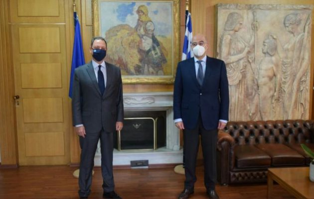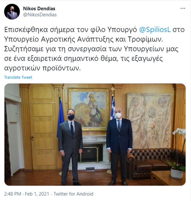 »Συζητήσαμε για τη συνεργασία των Υπουργείων μας σε ένα εξαιρετικά σημαντικό θέμα, τις εξαγωγές αγροτικών προϊόντων», έγραψε ο επικεφαλής της ελληνικής διπλωματίας στο Twitter.