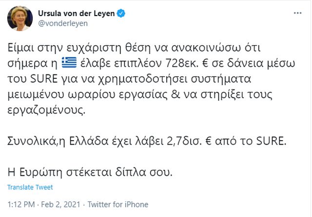Με ένα μήνυμα στα ελληνικά η Πρόεδρος της Κομισιόν, Ούρσουλα φον ντερ Λάιεν, ανακοίνωσε την εκταμίευση των 728 εκατομμυρίων ευρώ του SURE στην Ελλάδα.