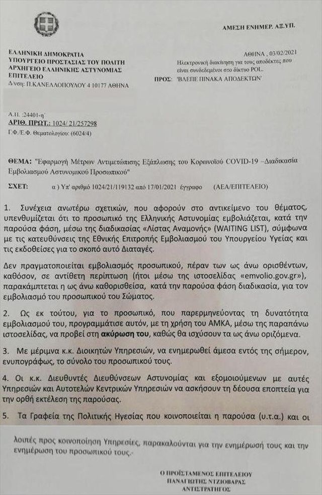Με έγγραφο του Αρχηγείου της ΕΛ.ΑΣ., σημειώνει ο κ. Σπίρτζης, το οποίο και επισυνάπτει στην ανακοίνωσή του, οι αστυνομικοί διατάσσονται να ακυρώσουν τα προγραμματισμένα ραντεβού για εμβολιασμό προστασίας από τον κορωνοϊό όπως προβλέπεται για όλους τους πολίτες, μέσω της ιστοσελίδας emvolio.gov.gr.