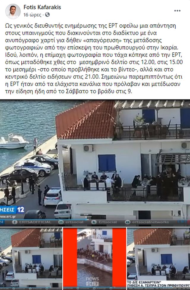 «Ως γενικός διευθυντής ενημέρωσης της ΕΡΤ οφείλω μια απάντηση στους υπαινιγμούς που διακινούνται στο διαδίκτυο με ένα ανυπόγραφο χαρτί για δήθεν “απαγόρευση” της μετάδοσης φωτογραφιών από την επίσκεψη του πρωθυπουργού στην Ικαρία», αναφέρει σε ανάρτησή του στα μέσα κοινωνικής δικτύωσης.