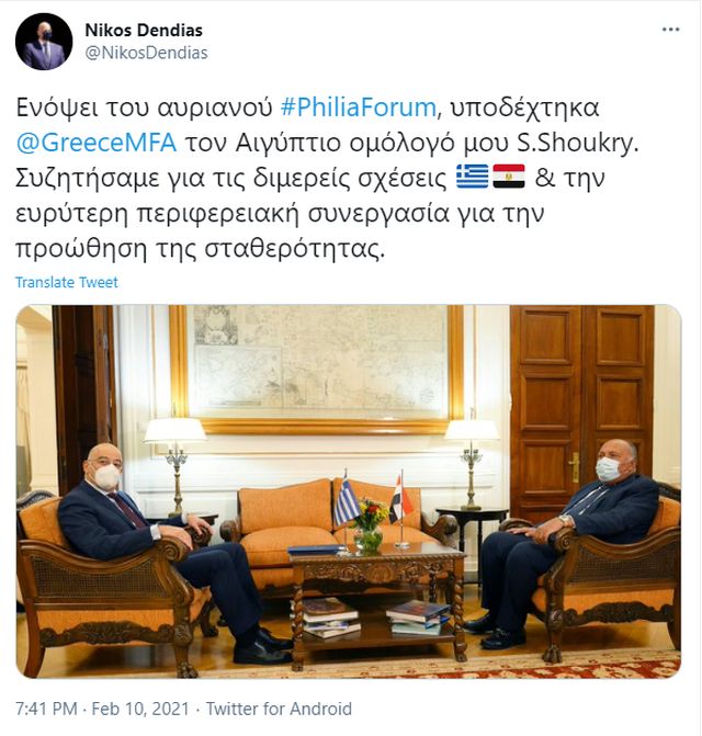 «Ενόψει του αυριανού Φόρουμ Φιλίας, υποδέχτηκα στο ελληνικό υπουργείο Εξωτερικών τον Αιγύπτιο ομόλογό μου Σάμεχ Σούκρι.