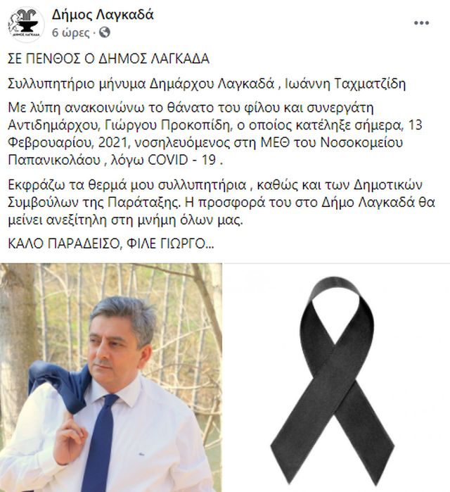 Τη μάχη με τον κορωνοϊό έχασε το Σάββατο 13/2 ο αντιδήμαρχος Λαγκαδά, Γιώργος Προκοπίδης, σκορπώντας θλίψη στην τοπική κοινωνία της Θεσσαλονίκης. Ο Γιώργος Προκοπίδης νοσηλευόταν στη ΜΕΘ Covid του νοσοκομείου Παπανικολάου.