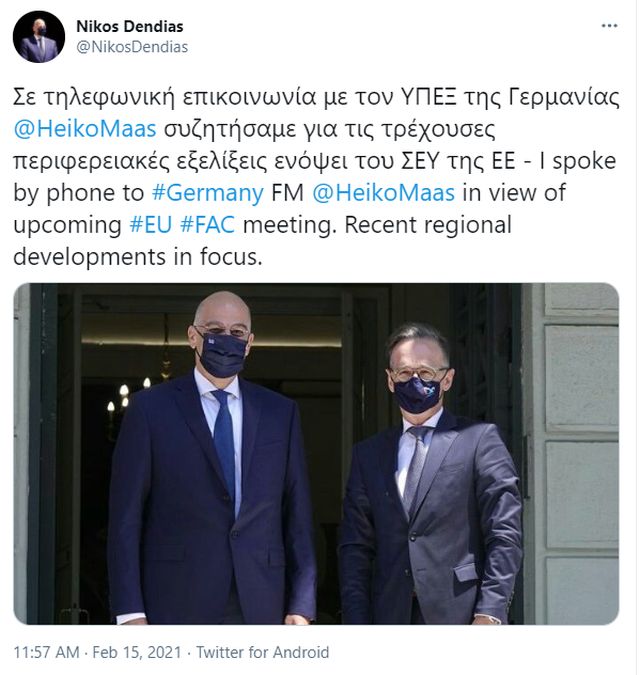 Τηλεφωνική επικοινωνία με το Γερμανό υπουργό Εξωτερικών Χάικο Μάας (Heiko Maas) είχε τη Δευτέρα ο υπουργός Εξωτερικών Νίκος Δένδιας.