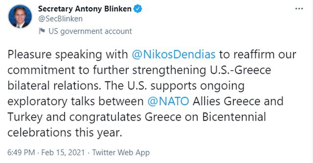 «Επιβεβαιώσαμε τη δέσμευσή της για περαιτέρω ενίσχυση των διμερών σχέσεων ΗΠΑ-Ελλάδας» έγραψε, προσθέτοντας ότι οι ΗΠΑ υποστηρίζουν την επανέναρξη των διερευνητικών συνομιλιών μεταξύ Ελλάδας και Τουρκίας.
