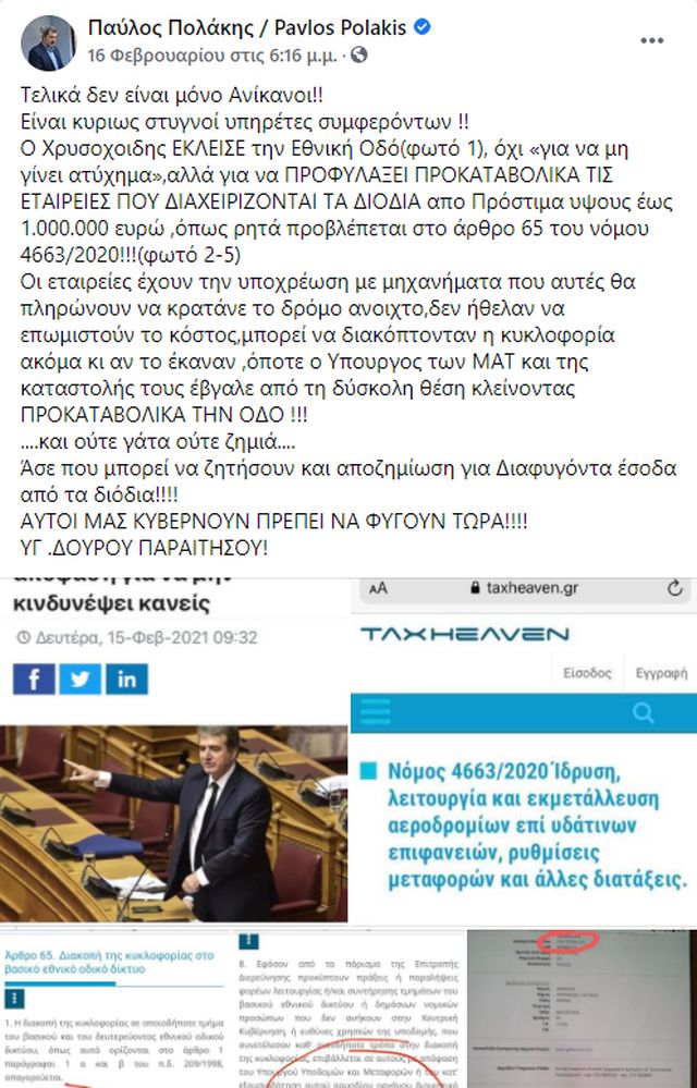 »Ο Χρυσοχοιδης ΕΚΛΕΙΣΕ την Εθνική Οδό, όχι «για να μη γίνει ατύχημα», αλλά για να ΠΡΟΦΥΛΑΞΕΙ ΠΡΟΚΑΤΑΒΟΛΙΚΑ ΤΙΣ ΕΤΑΙΡΕΙΕΣ ΠΟΥ ΔΙΑΧΕΙΡΙΖΟΝΤΑΙ ΤΑ ΔΙΟΔΙΑ απο Πρόστιμα υψους έως 1.000.000 ευρώ, όπως ρητά προβλέπεται στο άρθρο 65 του νόμου 4663/2020!!!