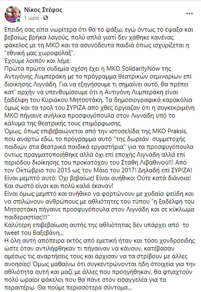 Δεν ήταν η ΜΚΟ Solidarity της Αντιγόνης Λυμπεράκη που συνεργαζόταν με το πρόγραμμα του Εθνικού Θεάτρου για θεατρικά σεμινάρια σε ασυνόδευτα παιδιά, έγραψε σε ανάρτησή του στο Facebook ο γνωστός δημοσιογράφος Νίκος Στέφος. Ο ίδιος μάλιστα σε δεύτερη ανάρτησή του προσθέτει ότι ήταν η ΜΚΟ Praksis και το πρόγραμμα για τα προσφυγόπουλα διήρκησε από τον Οκτώβριο του 2015 έως τον Μάιο του 2017, «δηλαδή επί ΣΥΡΙΖΑ» όπως σημειώνει ο δημοσιογράφος, προσθέτοντας βεβαίως ότι αυτό δεν ήταν ούτε μεμπτό, ούτε ανήθικο. «Είναι όμως μεμπτό και ανήθικο να φορτώνουν με χυδαία ψεύδη και να σπιλώνουν ανθρώπους με αθλιότητες του τύπου “η ξαδέλφη του Μητσοτάκη πήγαινε προσφυγόπουλα στον Λιγνάδη και σε κύκλωμα παιδεραστίας!!!”», τονίζει.