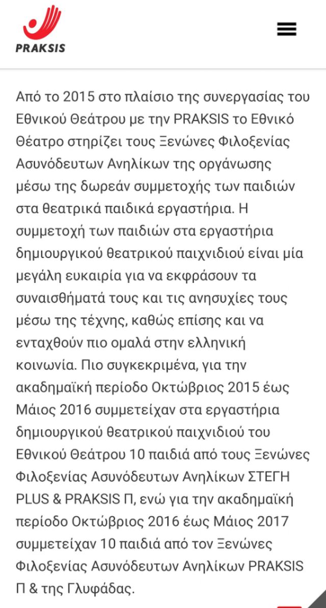 »Όμως, όπως επιβεβαιώνεται από την ιστοσελίδα της ΜΚΟ Praksis, που αναρτώ εδώ, το πρόγραμμα αυτό “της δωρεάν συμμετοχής παιδιών στα θεατρικά παιδικά εργαστήρια” για τα προσφυγόπουλα όντως πραγματοποιήθηκε αλλά όχι επί εποχής Λιγνάδη αλλά επί περιόδου διοίκησης του προκατόχου του Στάθη Λιβαθινού!!!