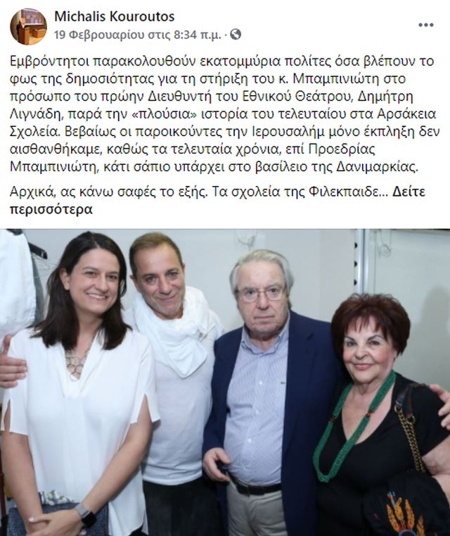 «Εμβρόντητοι παρακολουθούν εκατομμύρια πολίτες όσα βλέπουν το φως της δημοσιότητας για τη στήριξη του κ. Μπαμπινιώτη στο πρόσωπο του πρώην Διευθυντή του Εθνικού Θεάτρου, Δημήτρη Λιγνάδη, παρά την “πλούσια” ιστορία του τελευταίου στα Αρσάκεια Σχολεία.