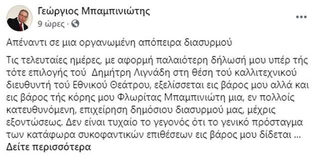 »Τις τελευταίες ημέρες, με αφορμή παλαιότερη δήλωσή μου υπέρ τής τότε επιλογής τού Δημήτρη Λιγνάδη στη θέση τού καλλιτεχνικού διευθυντή τού Εθνικού Θεάτρου, εξελίσσεται εις βάρος μου αλλά και εις βάρος τής κόρης μου Φλωρίτας Μπαμπινιώτη μια, εν πολλοίς κατευθυνόμενη, επιχείρηση δημόσιου διασυρμού μας, μέχρις εξοντώσεως.