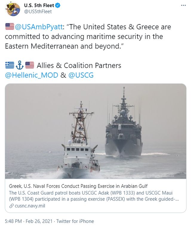 Όπως τονίζει σε ενθουσιώδη ανακοίνωσή του ο αμερικανικός Πέμπτος Στόλος και δημοσιεύεται στην ιστοσελίδα της Κεντρικής Διοίκησης του Αμερικανικού Πολεμικού Ναυτικού, η Ελλάδα είναι ένας ζωτικός σύμμαχος του ΝΑΤΟ, που αποδεικνύει τη δέσμευσή της για περιφερειακή ειρήνη και σταθερότητα.