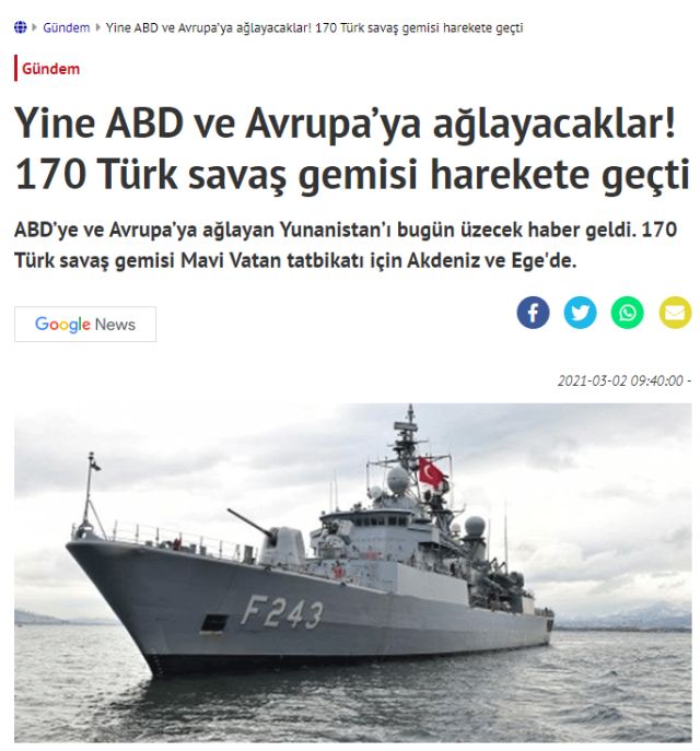 Τέλος, ίσως αξίζει να σημειωθεί ότι σύμφωνα με τη «Yeni Akit» η άσκηση «Γαλάζια Πατρίδα» είναι «προετοιμασία για πόλεμο», εννοώντας πόλεμο με την Ελλάδα.