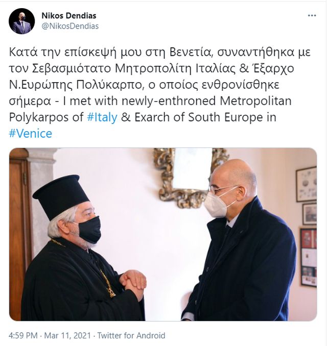 Ο Νίκος Δένδιας συναντήθηκε επίσης με τον Σεβασμιότατο Μητροπολίτη Ιταλίας και Έξαρχο Ν. Ευρώπης Πολύκαρπο, ο οποίος ενθρονίσθηκε την Πέμπτη.