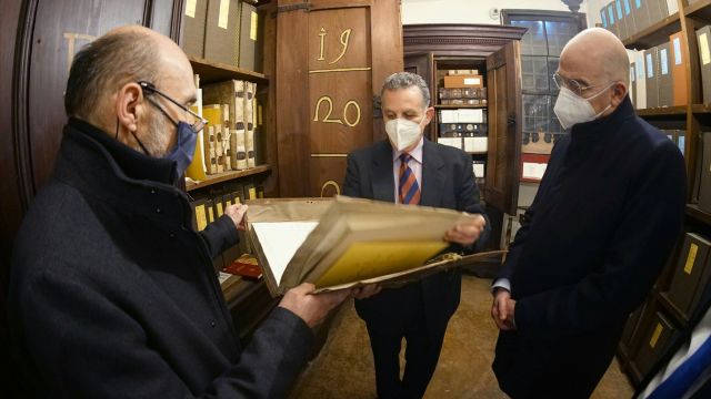 Ο Νίκος Δένδιας βλέπει κάποια από τα καλά φυλασσόμενα αρχεία του Ινστιτούτου.