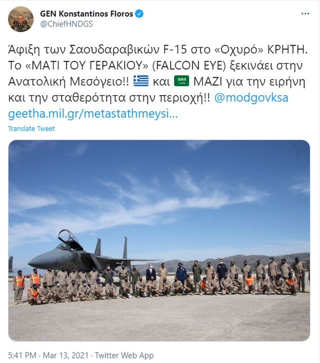 «Άφιξη των Σαουδαραβικών F-15 στο “Οχυρό” ΚΡΗΤΗ. Το “ΜΑΤΙ ΤΟΥ ΓΕΡΑΚΙΟΥ” (FALCON EYE) ξεκινάει στην Ανατολική Μεσόγειο!! Ελλάδα και Σαουδική Αραβία ΜΑΖΙ για την ειρήνη και την σταθερότητα στην περιοχή!!», έγραψε ο στρατηγός Φλώρος σε ανάρτησή του στο Twitter το απόγευμα του Σαββάτου, καλωσορίζοντας με αυτό το ισχυρό μήνυμα τους Σαουδάραβες συμμάχους μας στη 115 Πτέρυγα Μάχης στη Σούδα.