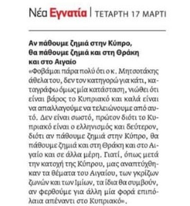 »Γιατί, όπως μετά την κατοχή της Κύπρου, μας αναπτύχθηκαν τα θέματα του Αιγαίου, των γκρίζων ζωνών και των Ιμίων, τα ίδια θα συμβούν, αν φερθούμε για μια άλλη φορά επιπόλαια απέναντι στο Κυπριακό».