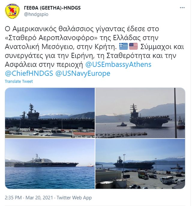 «Ο αμερικανικός θαλάσσιος γίγαντας έδεσε στο “Σταθερό Αεροπλανοφόρο” της Ελλάδας στην Ανατολική Μεσόγειο, στην Κρήτη. Ελλάδα και Ηνωμένες Πολιτείες σύμμαχοι και συνεργάτες για την Ειρήνη, τη Σταθερότητα και την Ασφάλεια στην περιοχή», αναφέρει σε ανάρτησή του στο Twitter το ΓΕΕΘΑ αναφορικά με την άφιξη του αεροπλανοφόρου «Αϊζενχάουερ» στη Σούδα.