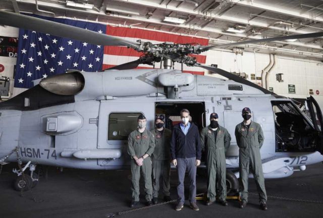 Ο Κυριάκος Μητσοτάκης αρχικά επισκέφθηκε υπόστεγο όπου φυλάσσεται ελικόπτερο MH-60R «Romeo», ένα από τα πλέον σύγχρονα ελικόπτερα του αμερικανικού Ναυτικού.