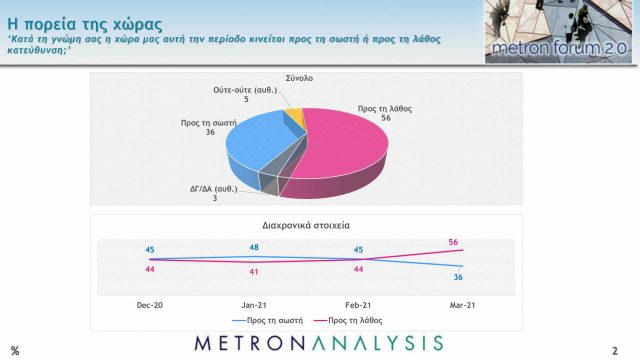 Στην ερώτηση για το αν η χώρα κινείται προς τη σωστή ή προς τη λάθος κατεύθυνση το 56% λέει προς την λάθος, μόλις το 36% προς τη σωστή, ενώ τέλος ούτε λάθος ούτε σωστή ένα 5%.