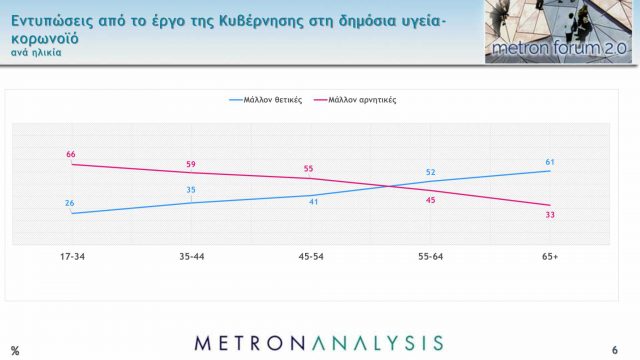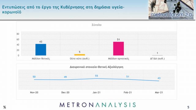 Σε ερώτηση για τις εντυπώσεις για τις κινήσεις της κυβέρνησης για τον κορωνοϊό και τη δημόσια υγεία το 51% την κρίνει μάλλον αρνητικά, το 43% μάλλον θετικά ενώ ένα 5% ούτε θετικά, ούτε αρνητικά.