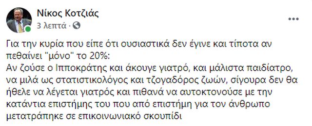 Με ένα ιδιαίτερο αιχμηρό σχόλιο ο Νίκος Κοτζιάς κατακεραύνωσε τη δήλωση της Βάνας Παπαυεαγγέλου, την οποία μάλιστα δεν θέλησε ούτε να κατονομάσει, για την αναφορά της ότι ένα 20% των ασθενών πεθαίνουν εκτός Μονάδων Εντατικής Θεραπείας (ΜΕΘ).