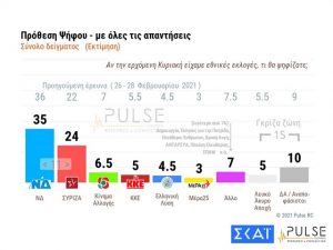 Στην πρόθεση ψήφου με όλες τις απαντήσεις, η «ψαλίδα» μεταξύ ΝΔ και ΣΥΡΙΖΑ είναι στις 11 μονάδες, με τη ΝΔ να συγκεντρώνει 35% και τον ΣΥΡΙΖΑ 25%.