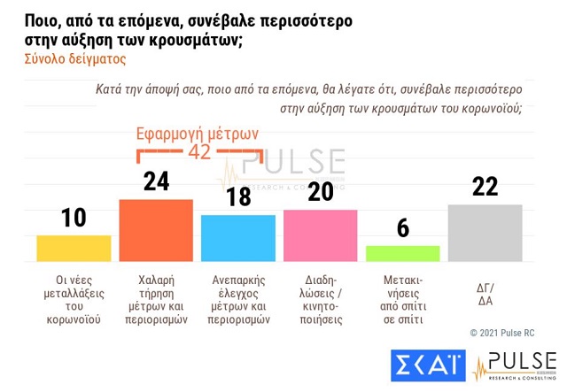 Συγκεκριμένα σχετικά με τις αιτίες που οδήγησαν σε αύξηση των κρουσμάτων κορωνοϊού, το 42% εκτιμούν ότι οφείλεται στην εφαρμογή των μέτρων, που προφανώς γι αυτό ευθύνεται η κυβέρνηση που τα σχεδίασε και προσπάθησε ανεπιτυχώς να τα εφαρμόσει.