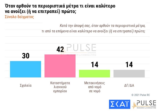 Για τις δραστηριότητες που πρέπει να ανοίξουν το 42% εκτιμούν ότι πρώτα πρέπει να ανοίξει το λιανεμπόριο, το 30% επιθυμούν να ανοίξουν αρχικά τα σχολεία και το 14% οι μετακινήσεις από νομό σε νομό.