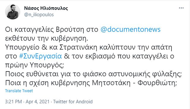 «Οι καταγγελίες Βρούτση στο @documentonews εκθέτουν την κυβέρνηση», γράφει σε ανάρτησή του στο Twitter ο Νάσος Ηλιόπουλος.