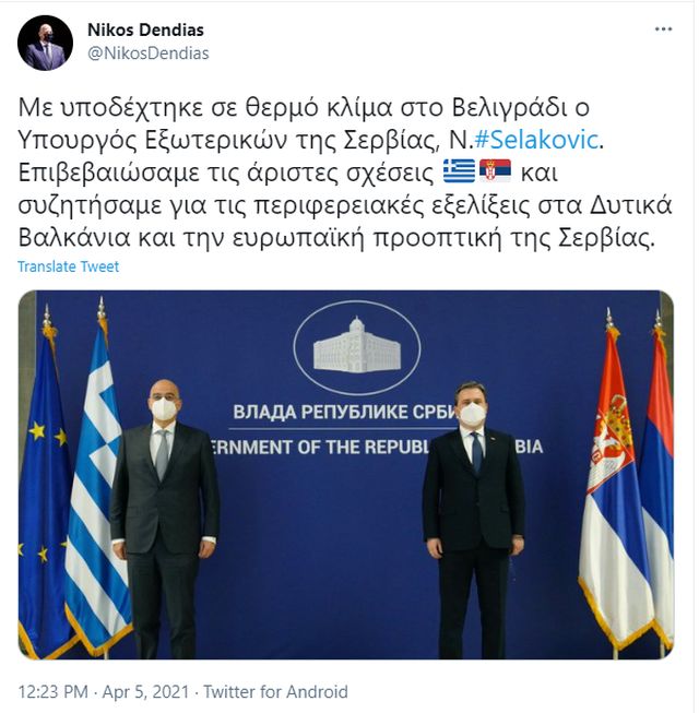 Η πλήρης δήλωση Δένδια, μετά το πέρας της συνάντησής του με τον υπουργό Εξωτερικών της Σερβίας, Nikola Selaković (Βελιγράδι, 05.04.2021):
