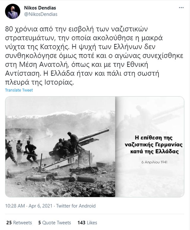 Στα 80 χρόνια από την εισβολή της ναζιστικής Γερμανίας στην Ελλάδα αναφέρθηκε ο υπουργός Εξωτερικών Νίκος Δένδιας.